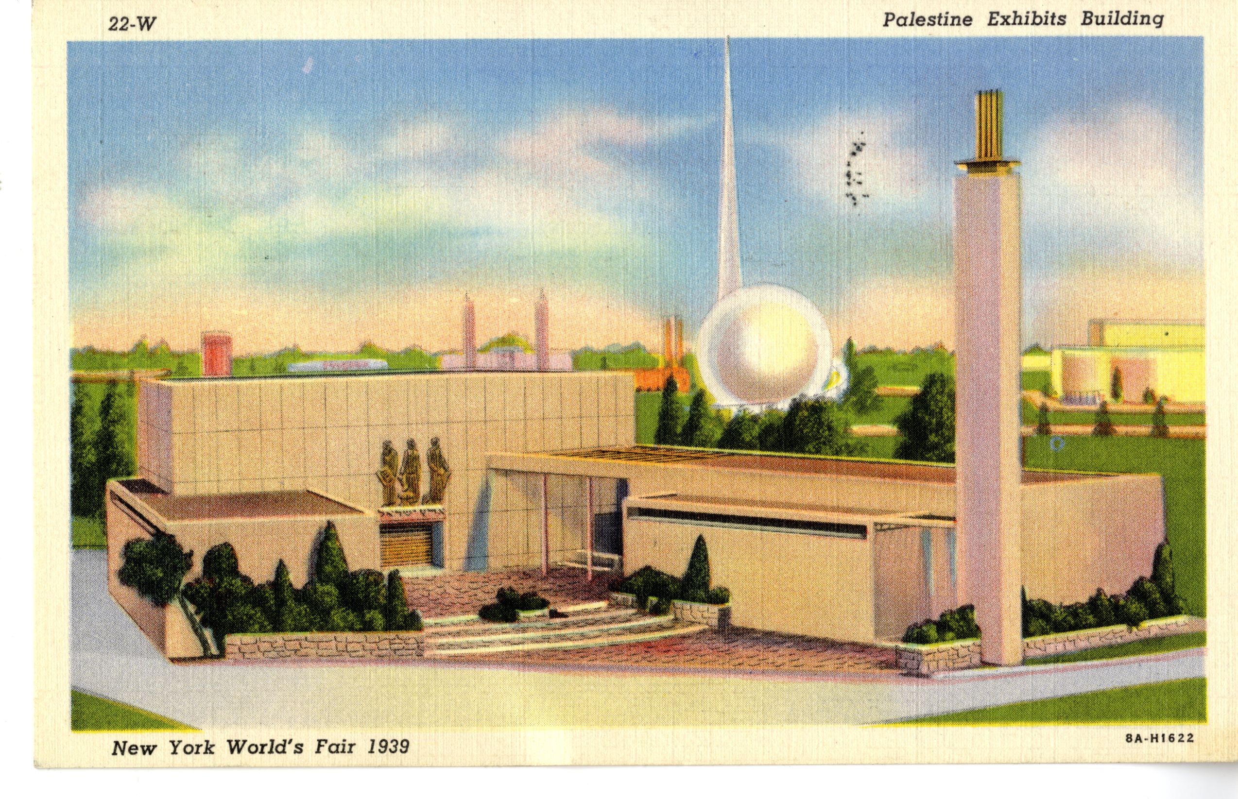 "Jewish Palestine Exhibit Building - New York World's Fair. The Palestine Exhibit at the New York World's Fair is located in the Community Interests Zone. The architects are El-Hanani and Norvin R. Lindheim." Collection of Shulamith Z. Berger